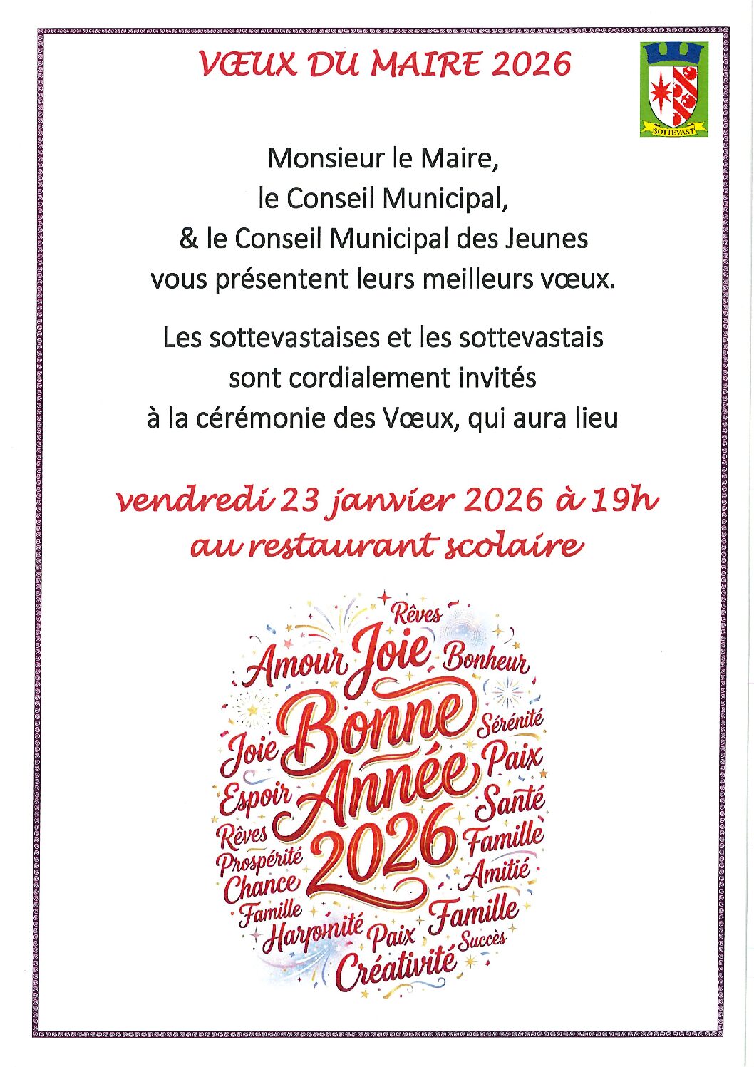 La cérémonies des voeux 2026 aura lieu cette année au nouveau restaurant scolaire (rue des Demoiselles). Vendredi 23 janvier2026 à 19 h.