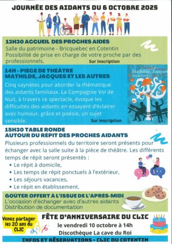 Le CLIC du Cotentin propose, en partenariat avec le CCAS de Bricquebec et l’ASEPT Normandie une après-midi à destination des aidants. La compagnie Vol de Nuit, à travers son spectacle sur les aidants familiaux, évoque les difficultés des aidants en essayant d’éclairer avec humour, grâce et poésie, un sujet sensible.